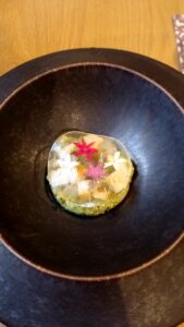 ↑表面の透明なのはトマトで作られてるそうで見た目が華やかでした。中の花も食べれてアワビなども入っていました。